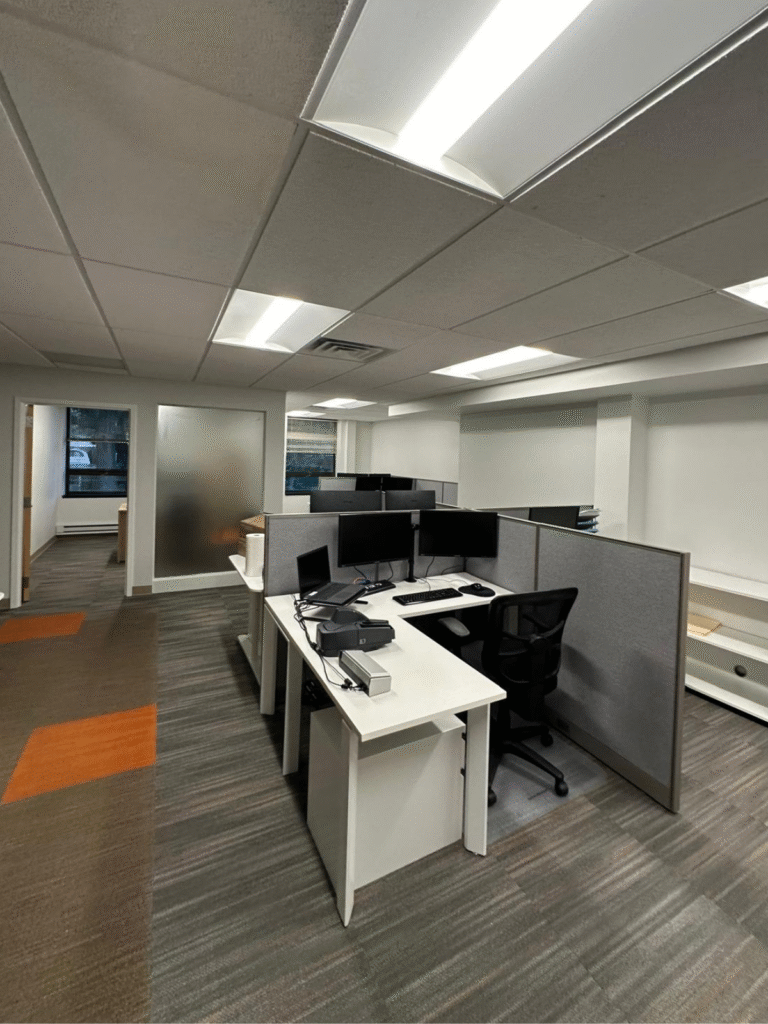 Complete office build-out featuring new partitions, proper lighting, fresh paint, and an organized layout.